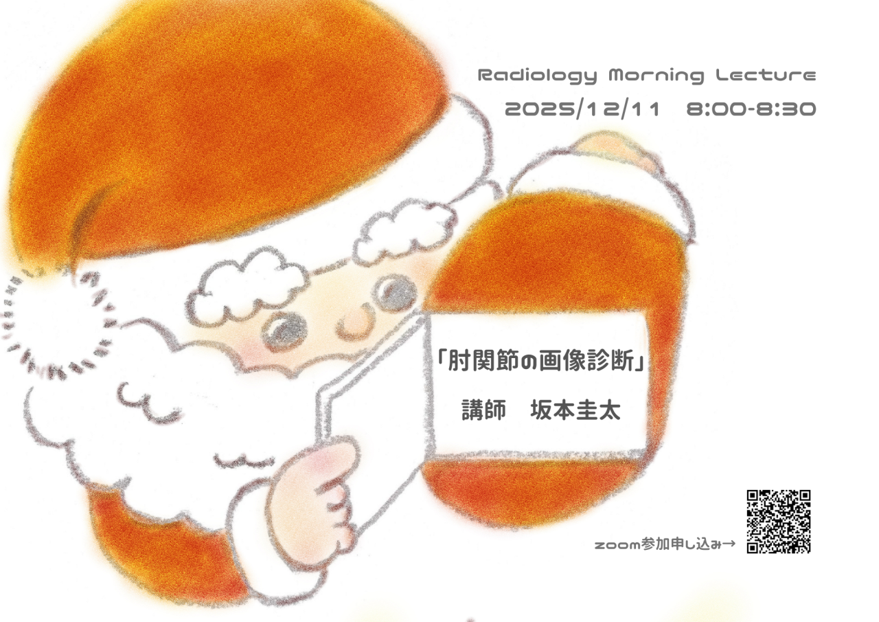 ニュース Radiology Morning Lecture のご案内 2025年12月03日 Radiology Morning Lecture のご案内です。 2025年12月11日 木曜日 (8:00~8:30) 坂本圭太先生による公開講座「肘関節の画像診断」が開催されます。 どなたでもお気軽にご参加下さい。
